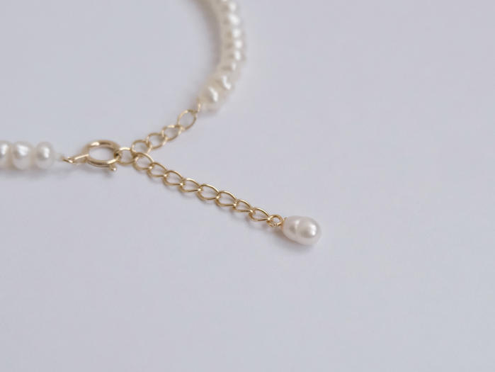 長い時間をかけて作られるため真珠層が厚く、汗や水に強いのもびわ湖真珠の特徴。汗をかいた日や手洗いなどで水に濡れた場合は、ハンカチやタオルで一緒に軽く拭いていただくだけで、それ以外の特別なお手入れは必要ありません。